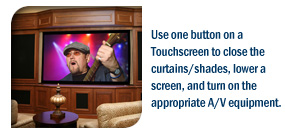 Reduce the number of remotes you need with HAI's OmniTouch 10p portable Touchscreen to control all of your media and home control functions. Use your Touchscreen to select a movie from your library that you'd like to enjoy. Turn up the volume or change MP3 songs from the comfort of your couch. Use the same Touchscreen to adjust temperatures, lighting, and more for an enhanced theater experience. Push one button on the Touchscreen to close the curtains/shades, dim the lights, lower a screen, adjust the temperature, activate the security system, and turn on the appropriate A/V equipment. HAI's Home Theater Extender (PDF) provides IR support for HAI's IP-Based Touchscreens and includes over 300,000 built-in Audio/Video IR codes. Surveillance video can be displayed on the Touchscreen or TV when a guest arrives at the front door. The movie will pause until you're ready, and you can even push a button to let your visitor inside.